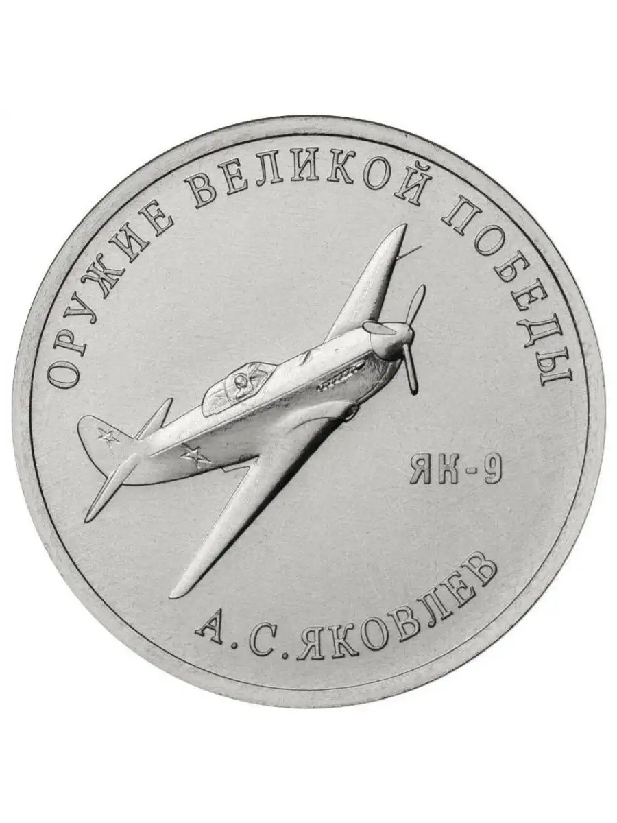 - Реверс: рельефное изображение истребителя Як-9, надписи «ЯК-9», «ОРУЖИЕ ВЕЛИКОЙ ПОБЕДЫ» и «А.С. ЯКОВЛЕВ»