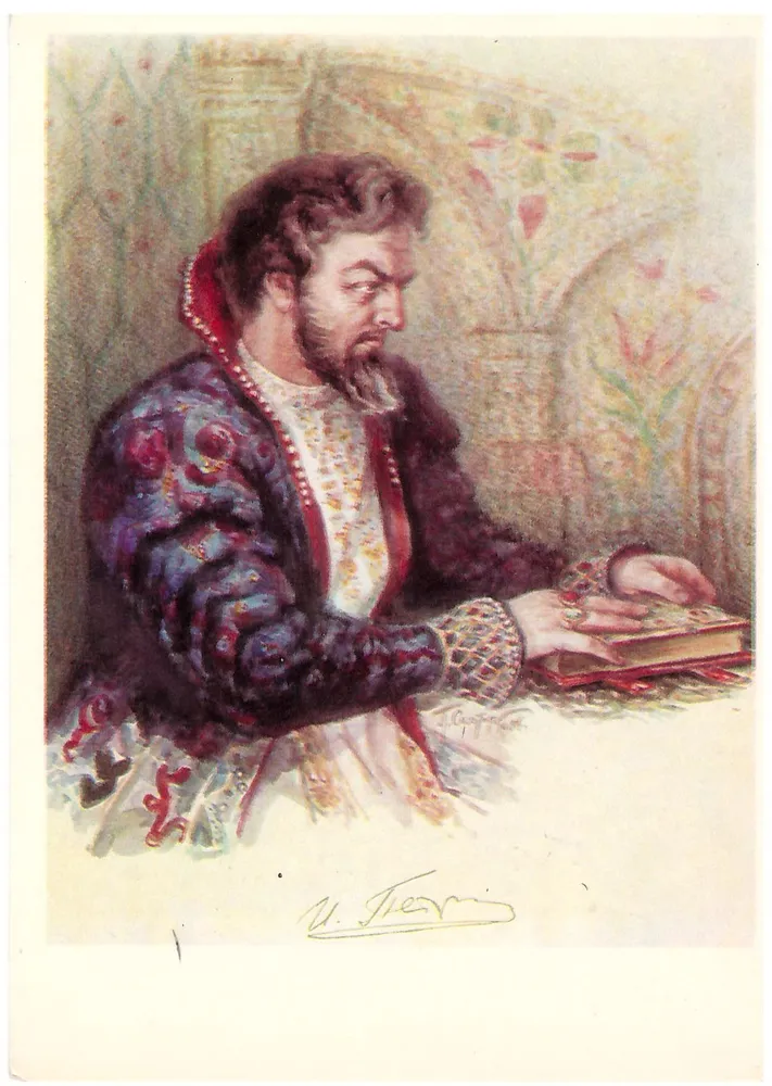 Почтовая открытка Народный артист СССР лауреат Государственных премий ССССР И.И. Петров в роли Бориса Годунова (опера М. Мусоргского "Борис Годунов")